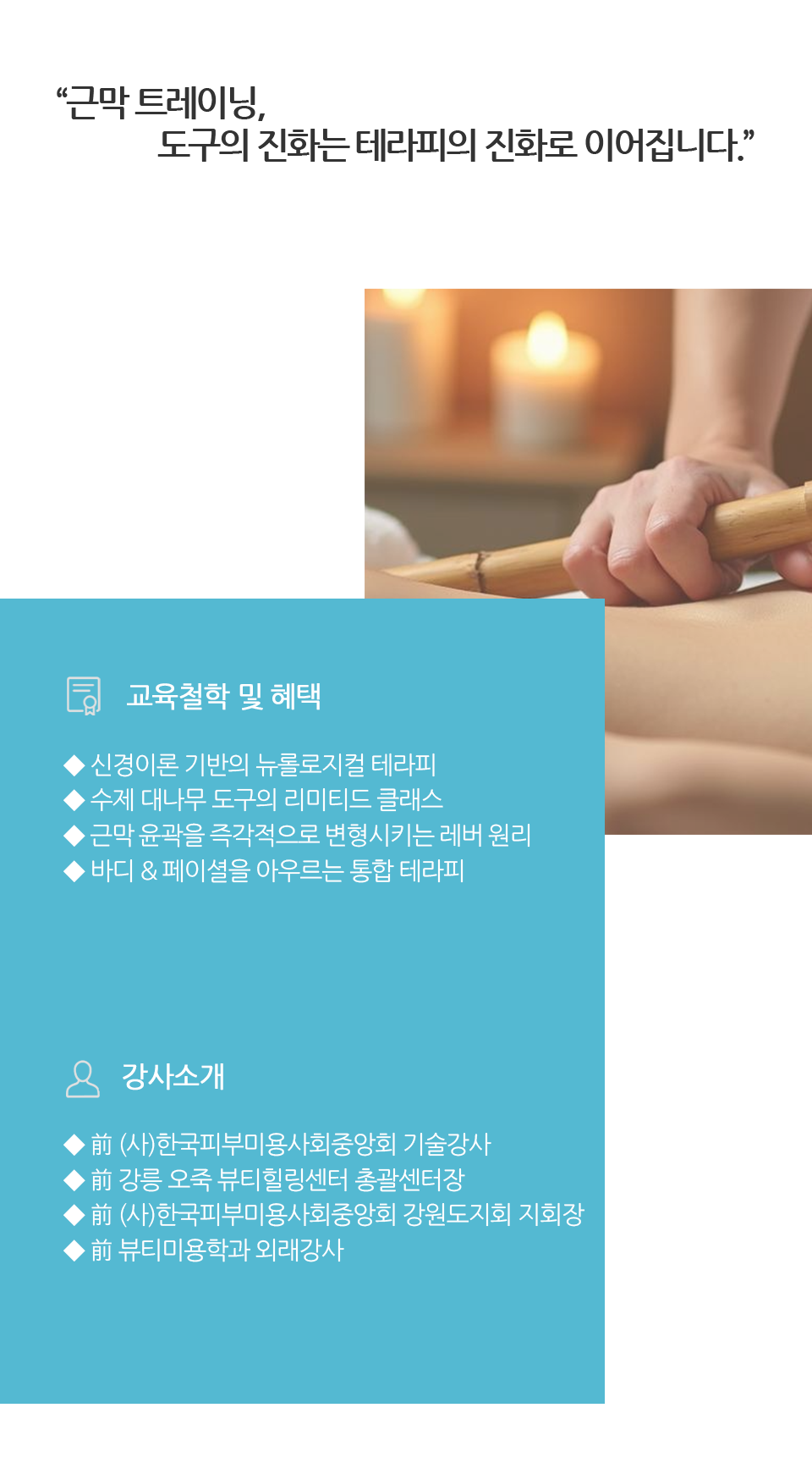 전통적인 뱀부 마사지의 틀을 넘어, 해부학과 신경이론, 그리고 코몽드만의 기법이 결합된 새로운 건식 테라피 프로그램 -키네스테 뱀부를 소개합니다.