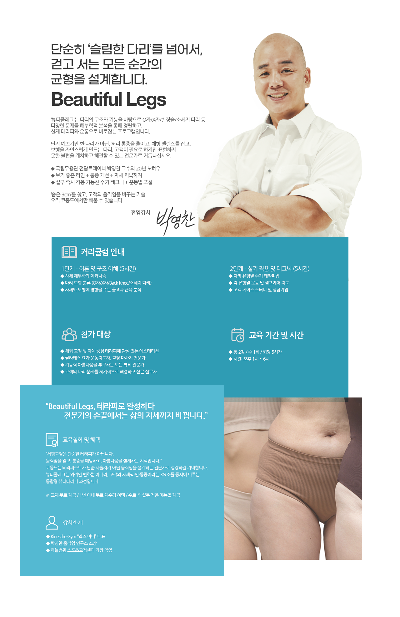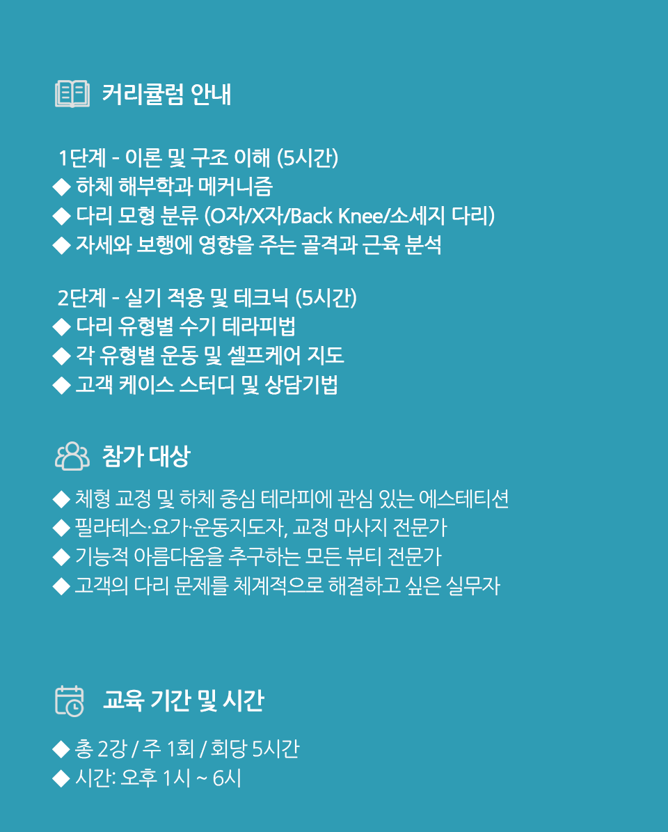체형 교정 전문가 박영찬 교수의 해부학 기반 커리큘럼으로, OX자 다리, 반장슬, 소세지 다리 등 다양한 하체 변형을 아름답고 기능적으로 회복하는 전문 과정입니다.