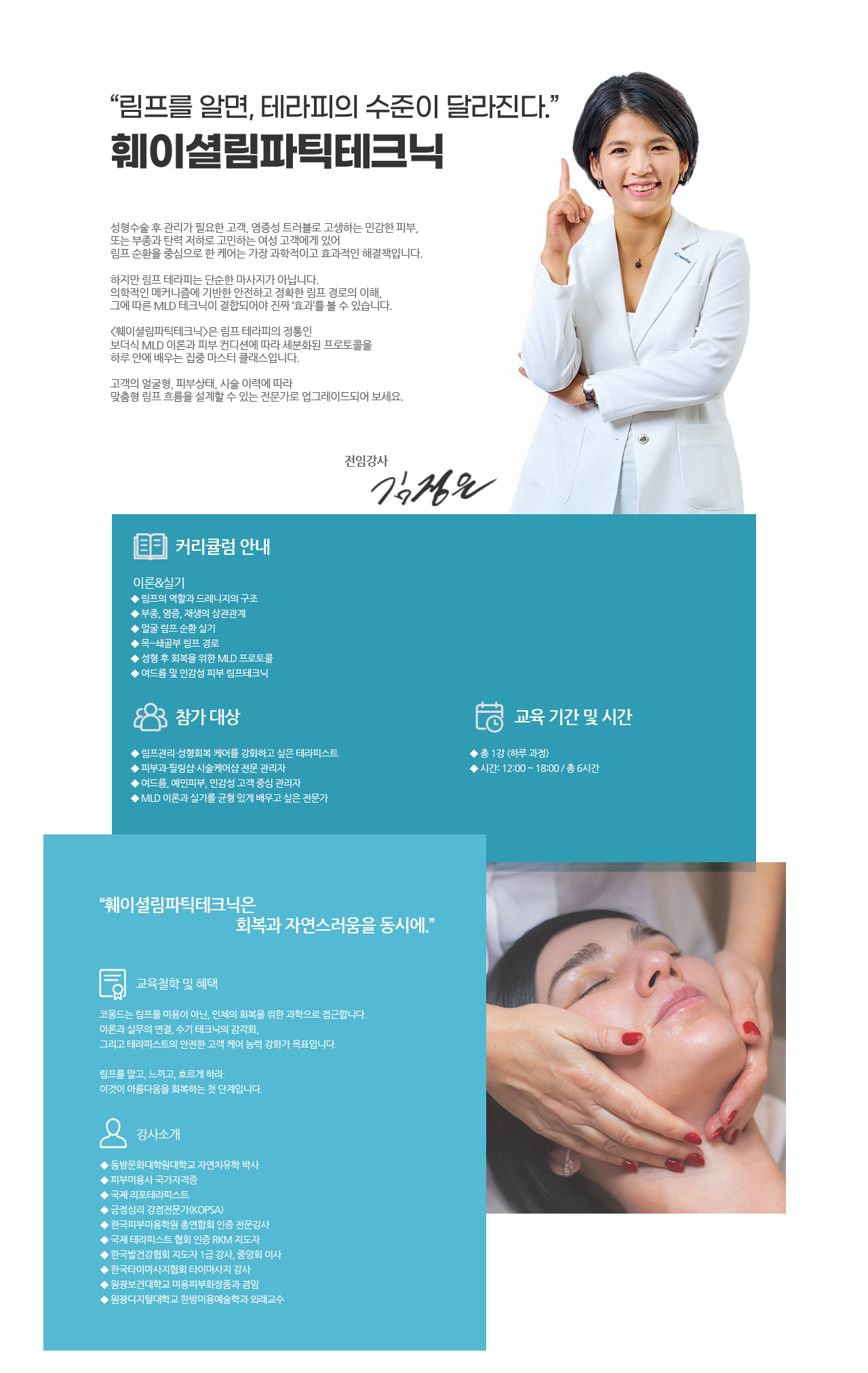 "수술 후 케어도, 시술 후 회복도 림프가 중심"이라는 철학으로 피부과, 에스테틱, 스파, 클리닉 등 현장에 즉시 적용 가능한 실전형 프로그램을 만들어 왔습니다.