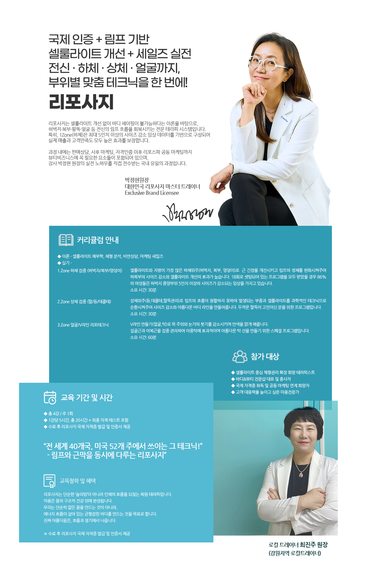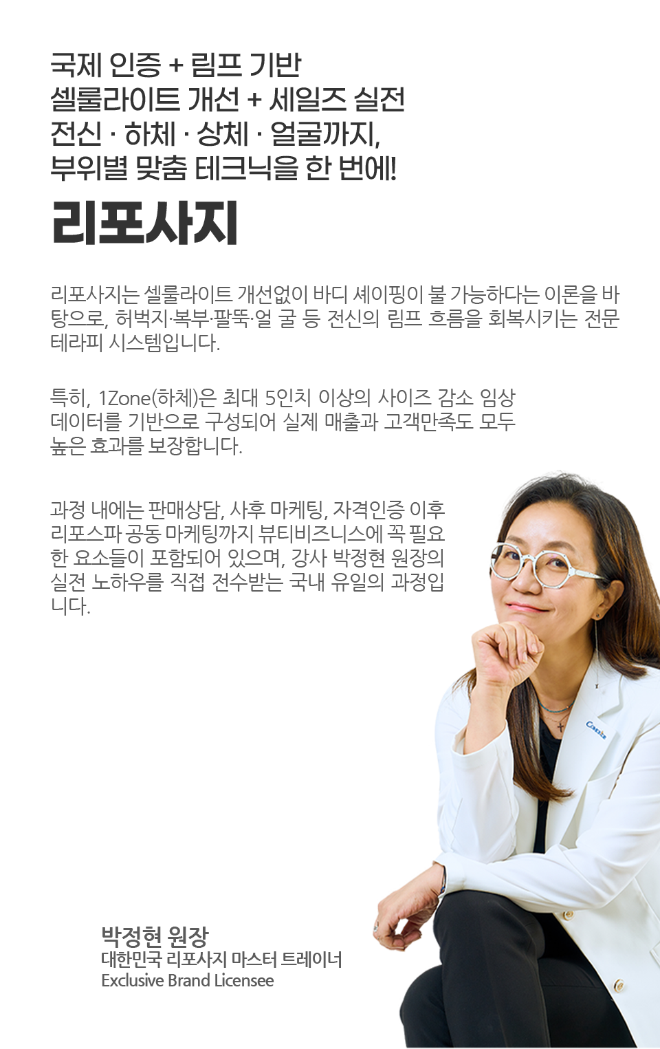 마치 리포사지가 셀룰라이트 전문관리의 대명사인듯 사용될 정도입니다. 첫 1강을 수강하는즉시 매출이 발생하는 강력한 브랜드 파워를 느낄 수 있는 "국제자격증"으로 전세계 어디서도 리포사지 프랙티셔너로 활동할 수 있습니다.